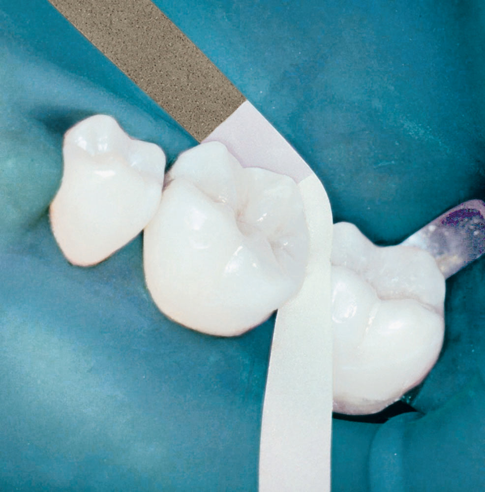 In the same strip, one end (gray) is of medium abrasiveness, and the other (white) is of fine abrasiveness. To facilitate access to the interproximal, the center is neutral and finer.
